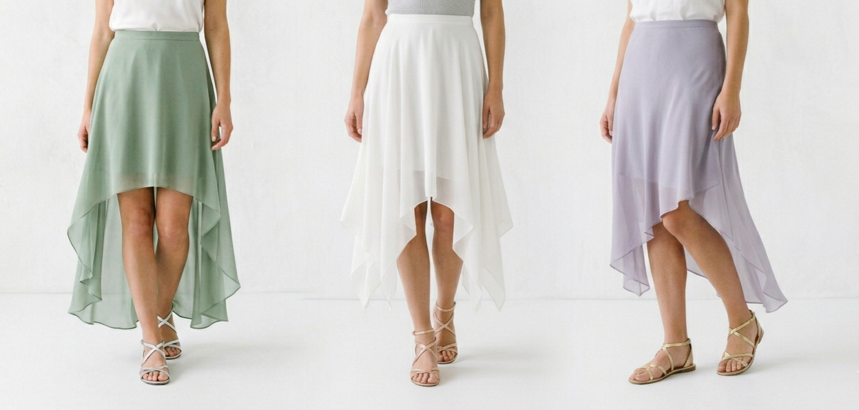 Yes! For instance, high-low dresses, handkerchief hem dresses, and asymmetrical hem dresses can end around knee-length or even above at their shortest point. But despite their moderate length, these styles frequently read as Ethereal, because of their curving diagonal lines (diagonal lines help create the illusion of greater length):